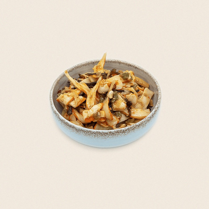 chou, calamar, fougère, gingembre, champignon noir, piment doux, sésame, soja