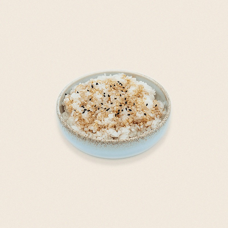 Bol de riz nature assaisonné à la sauce soja sucrée et saupoudré de graines de sésame