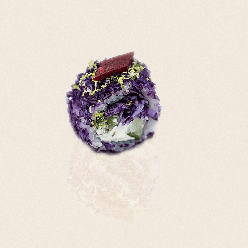 Le PurpleCali est un california à base, de concombre , de cheese, de cebette, et de choux. Le tout enrobé de choux rouge, et soupoudré d'un zeste de citron vert. roll vegetarien plein de fondant et de peps!
