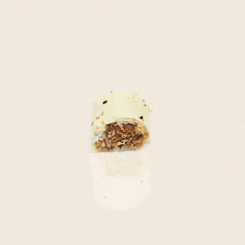 riz nature, caramel beurre salé, éclats de caramel, noix de pécan et feuille de soja au sésame