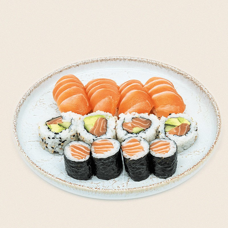 La formule midi saumon est composée d'une entrée au choix, d'une boisson, et d'un plateau de 4 nigiri, 4 california et 4 maki au saumon
